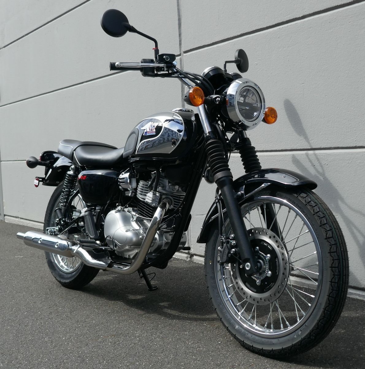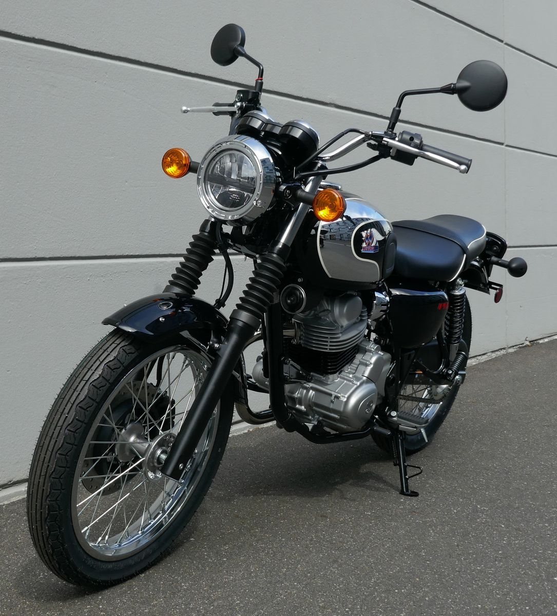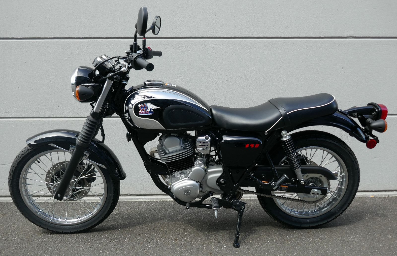 Der Kraftstofftank hat eine tropfenförmige Form, die zum Meguro-inspirierten Aussehen der Maschine beiträgt, und verfügt über ein neu gestaltetes 3D-Meguro-Emblem, das direkt ins Auge fällt und dies als Meguro-Modell identifiziert.