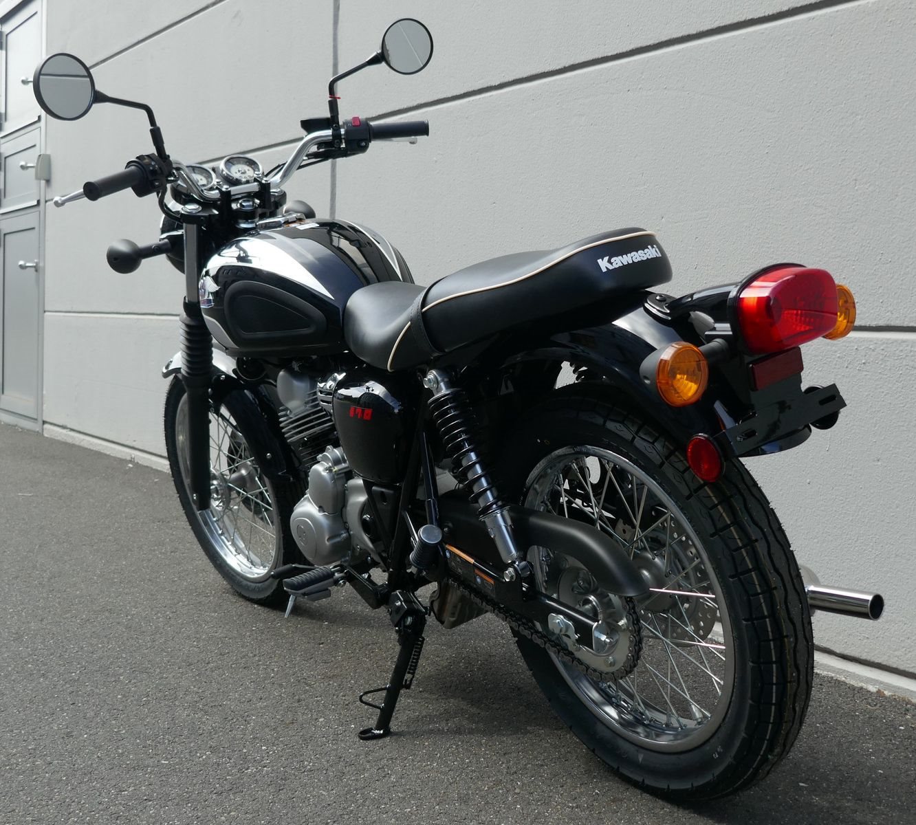 Der elegante, klassische Meguro-Look wird durch das originale Scheinwerfergehäuse, das Rücklicht im Retro-Stil und die großen Blinker verstärkt.
